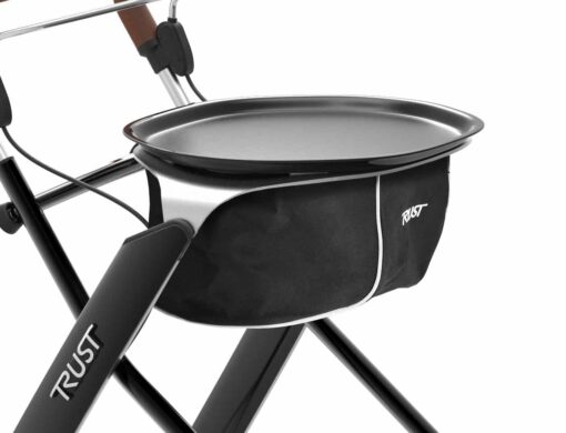 Som tillbehör medföljer en bricka vilket du kan ta med dig en måltid på. Du kan även vända rullatorn emot dig när du sitter ned och använda brickan som ett litet bord.